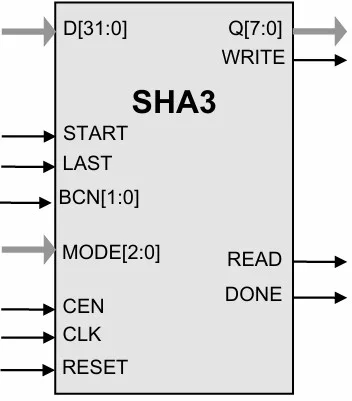 The SHA cores provide implementation of cryptographic hashes “Keccak” SHA-3 (cores SHA3-224, SHA3-256, SHA3-384 and SHA3-512) and (optionally) the corresponding hash-based HMAC, KMAC, and XOF (SHAKE) functions