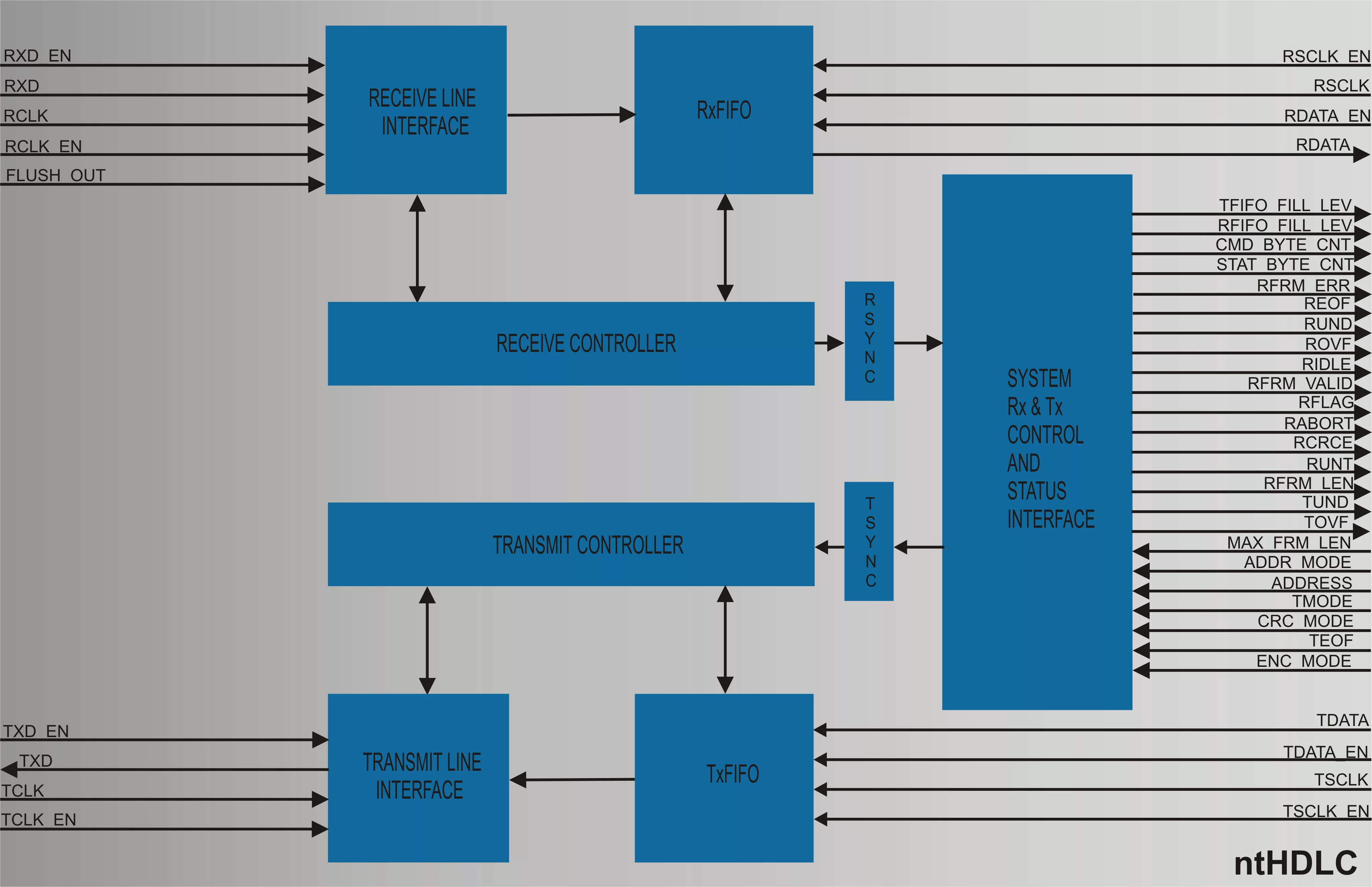 Noesis Technologies ntHDLC single channel High-Level Data Link Controller (HDLC) is a full-duplex transceiver with independent transmit and receive units for synchronous framing bit-level HDLC protocol operations. The ntHDLC can handle interframe and delimiting flags, frame check sequence based on CCITT CRC16/CRC32 polynomial, normal or transparent transmission modes, abort generation and detection. The system interface is very flexible and can be adapted towards FIFO, uP, or DMA controllers. The transmit and receive units and their associated control and status logic are independent. This partitioning strategy enables the Tx and Rx units to be instantiated in different place and/or level of the design hierarchy. Each unit (Tx, Rx and back-end interface) has its own clock domain with synchronous clock enable. Communication between the various clock domains is achieved via synchronization logic blocks.