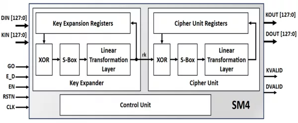 The SM4 IP core implements a custom hardware accelerator for the SM4 symmetric block cipher, specified in Chinese national standard GB/T 32907-2016, and ISO/IEC 18033-3:2010/Amd 1:2021.