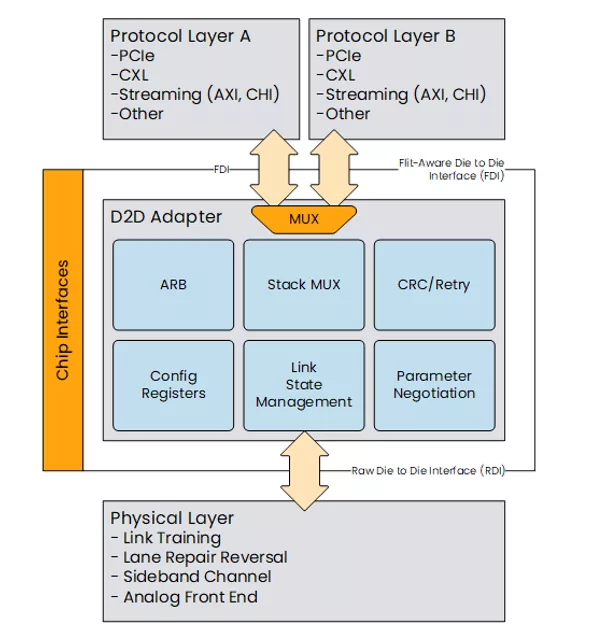 The Die to Die Adapter IP interfaces to the UCIe Serdes with the Raw Die to Die Interface (RDI) and to the Protocol Layer with the Flit-Aware Die to Die Interface (FDI). The IP is highly customizable and contains blocks for CRC / Retry logic as well as Protocol and Stack Multiplexers