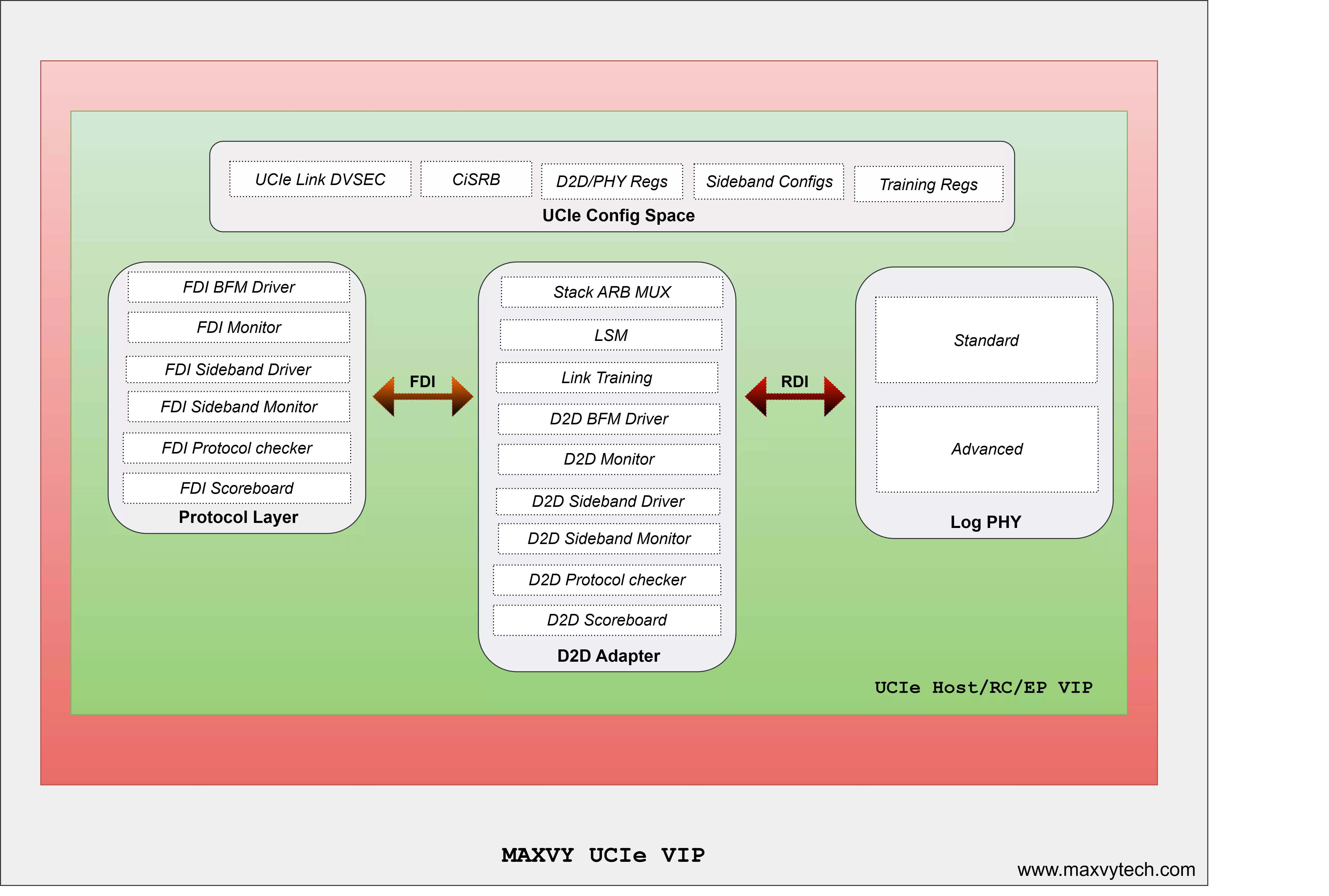 - Support for UCIe PCIe extended config space, unit-level FDI/RDI driver mode BFMs for standalone PHY testing, RDI BFM for simplified direct protocol/D2D only testing, etc.