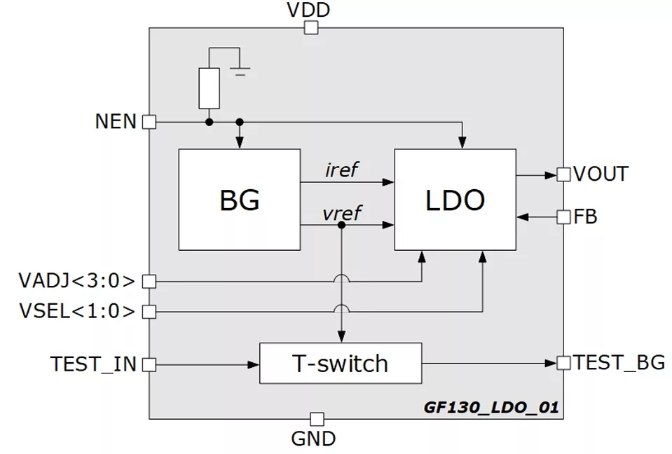130GF_LDO_01 stabilizes the external voltage and forms an output level of the specified value.
