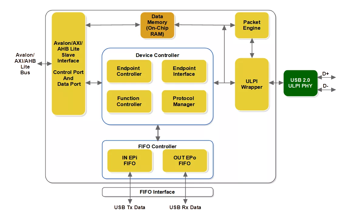 The USB 2.0 Device, Software Enumeration FIFO interface (USB20SF) IP Core is a FIFO based USB 2.0 device core with 32-bit Avalon/AXI/AHB Lite interface and ULPI interface support.