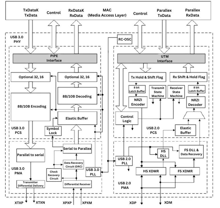 The USB 3.0 PHY IP Core is a transceiver provided for supplementary devices, compliant with UTMI (USB SuperSpeed), USB 3.0, and USB 2.0 PIPE requirements. With minimal power consumption and chip area requirements, the USB3.0 PHY IP transceiver doesn't sacrifice speed or data throughput. The USB3.0 PHY IP offers complete support for high-performance designs by offering an integrated self-test module with integrated jitter injection, a dynamic equalization circuit, and a complete on-chip physical transceiver solution with Electrostatic Discharge (ESD) protection. Multiple IP sources can use the same PHY interface (PIPE) thanks to the USB3 MAC layer. Constant power, integrated Jitter Injection Output, integrated Self-Test, and approved customization of analog circuit characteristics remove internal test monitoring and jitter.