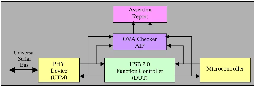 USB 2.0 OVA protocol rule Checker can work in a standalone mode i.e., can be plugged in any design verification environment, which uses the standard Protocol without disturbing the structure.