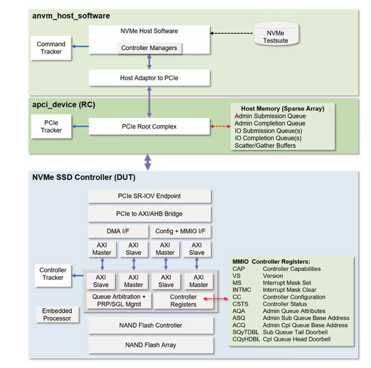 The Avery NVMe test environment solution provides comprehensive verification featuring an advanced UVM environment that incorporates constrained random traffic generation, robust packet, link, and physical layer controls and error injection, protocol checks and coverage, functional coverage, protocol analyz er-like features for debugging, and performance analysis metrics.