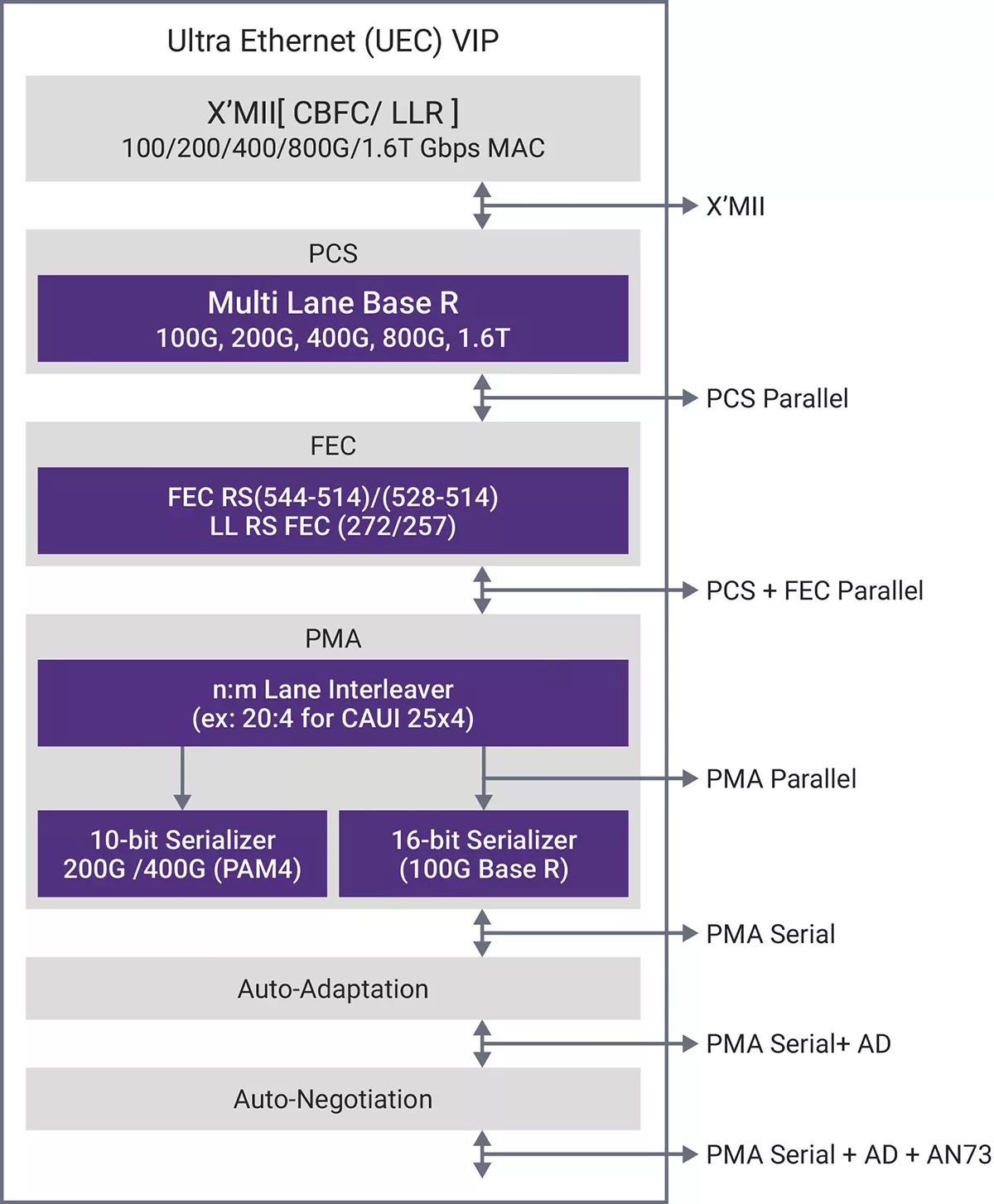 - DUT Types/Topology: multiple topologies for various DUT types such as X’MII DUT, PCS+PHY DUT, MAC+PCS+PHY DUT (Full Stack)