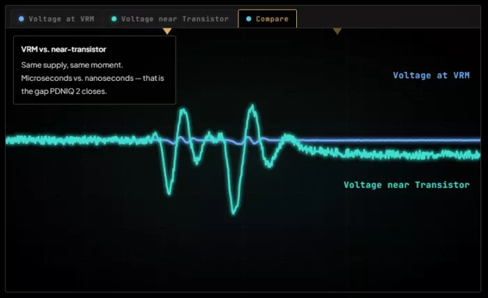 Figure 1. A VRM-level monitor sees the supply as smooth; the on-die sensor captures the full nanosecond droop and ringing at the transistor. Hover the channels to isolate.