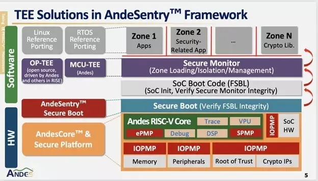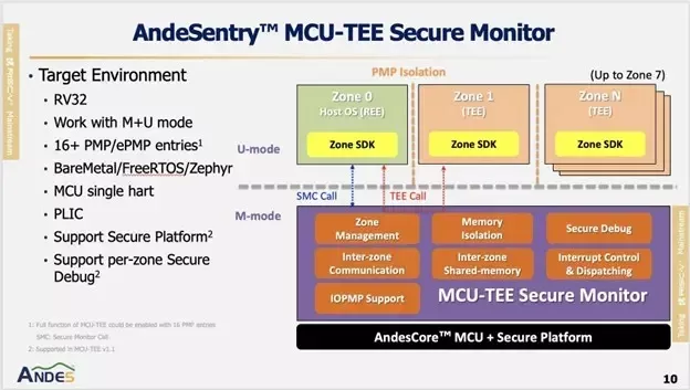 Andes’ MCU-TEE Secure Monitor is designed for single-hart, 32-bit MCU-class systems. The RISC-V hart operates using only M-mode and U-mode and provides 16 or more PMP/ePMP entries for memory protection. This solution targets embedded operating environments such as Bare Metal, FreeRTOS, and Zephyr. A key feature of the MCU-TEE Secure Monitor is support for per-zone Secure Debug, which enhances security when debug capabilities are enabled.