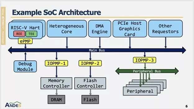 To enforce isolation between execution environments on a hart, enhanced Physical Memory Protection (ePMP) is used to restrict the physical address ranges that a hart is permitted to access for each execution environment; any unauthorized memory access is blocked by ePMP. For non-CPU bus initiators, such as DMA engines, IOPMP performs address validation to ensure that transactions comply with the access permissions configured by software, and any invalid transaction is similarly blocked by the IOPMP.