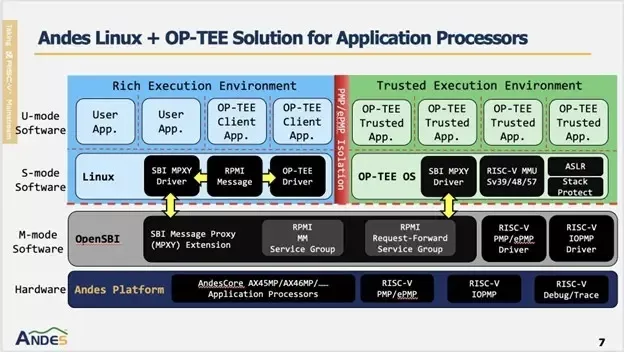 An OP-TEE based system supports two software execution environments: the Rich Execution Environment (REE) and the Trusted Execution Environment (TEE). Typically, the REE runs a general-purpose operating system, while the TEE runs a secure operating system. In the Andes solution, Linux is integrated as the general-purpose OS in the REE, and OP-TEE is deployed as the secure OS in the TEE. Most applications execute in Linux, whereas trusted applications run within OP-TEE. When protection of sensitive assets is required, developers can implement security-critical operations as OP-TEE trusted applications, ensuring that sensitive data is not exposed to the REE.