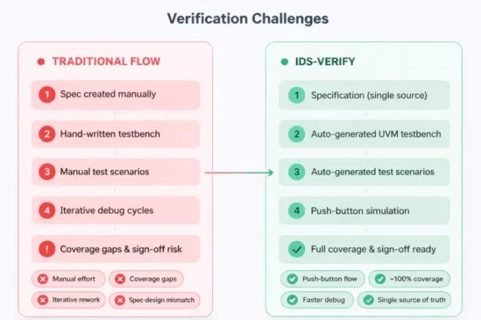 IDS-Verify™ transforms CSR,HSI, and CPU Interface verification by automating the entire flow from specification to sign-off. By generating complete verification environments, tests, and coverage models directly from specifications, it eliminates manual effort, improves consistency, and accelerates time-to-market.