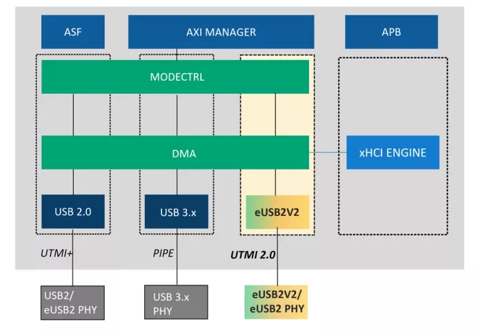 Figure 1 illustrates the eUSB2V2 controller architecture, combined with USB 3.x and USB 2.0 (eUSB2v1).
