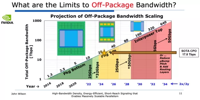 Figure 2: increase in total off-package bandwidth for Nvidia chips. In 2025 their Co-packaged photonics reached nearly 18 Tbps. They project to reach close to 400 Tbps by 2034.