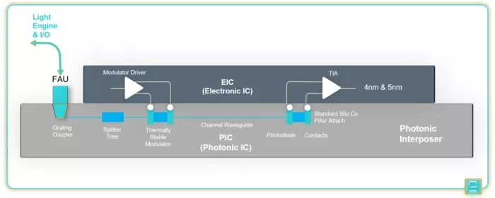- Integrated within TSMC 4nm and 5nm processes for the electric IC (EIC) on top of the photonic interposer (the PIC)