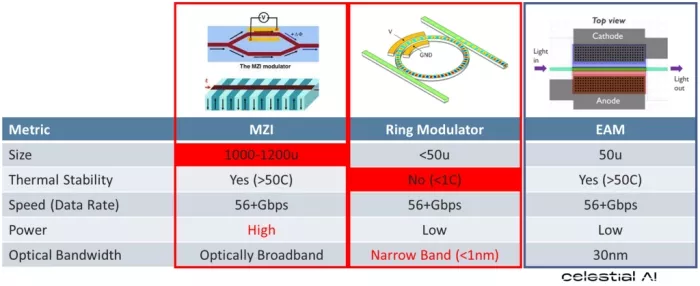 Figure 4: Different modulation techniques used in the PIC. Celestial.AI uses the EAM modulation because it is small, uses low amount of power and its operation is very stable across a broad temperature range. That enables its use below the ASIC.