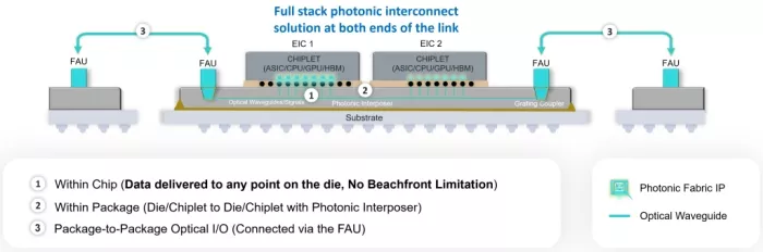 Figure 5: Photonic Fabric enables photonic communication within a single EIC chiplet, between chiplets on the same photonic interposer and to other devices across a fibre optic cable.