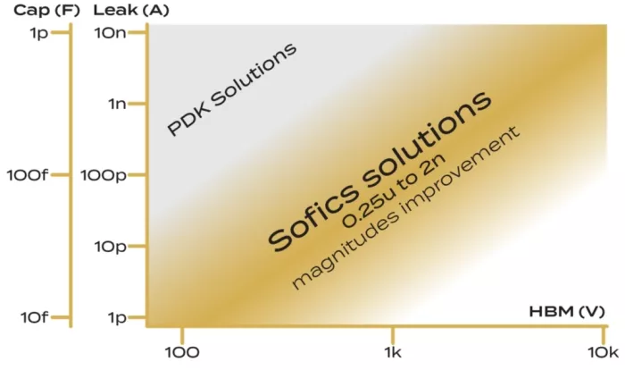 Figure 6: ESD protection solutions for different ESD robustness levels (horizontal axis using logarithmic scale) and parasitic capacitance and leakage (vertical axis using logarithmic scale). Sofics IP solutions validated on silicon and/or delivered to customers fall within the golden band, with both leakage and capacitance that is order(s) of magnitude lower than traditional or foundry provided ESD clamps.