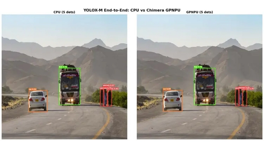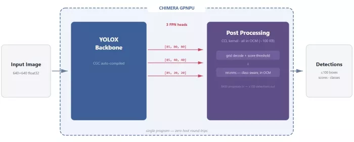 To make this concrete, here's a complete YOLOX-M detection pipeline running entirely on the Chimera GPNPU. No host CPU involvement after the input image is loaded.