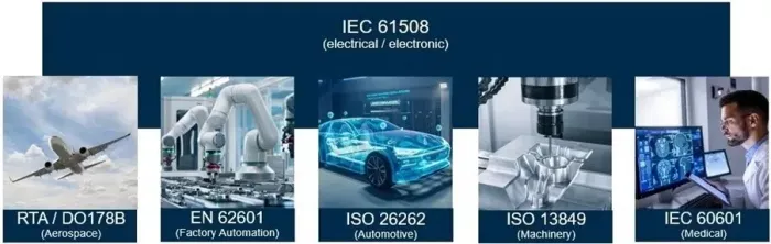 Using IEC 61508 as a starting point, each industry has evolved its own FuSa standard to focus on and address that industry’s unique requirements. These standards include RTA/DOI178B (Aerospace), EN 62601 (Factory Automation), IS0 26262 (Automotive), ISO 13849 (Machinery), and IEC 60601 (Medical).