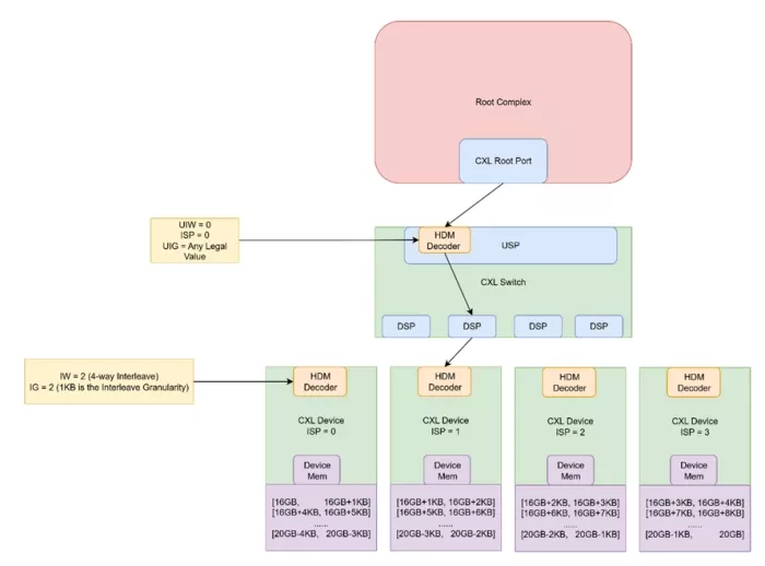 The following illustrates a simple memory fan-out topology with four memory devices behind a CXL switch. HDM decoder in each device, as well as the upstream switch port, is configured to decode the HPA range 16 GB to 20 GB, at 1-KB granularity. The leftmost device receives 1-KB ranges starting with HPAs 16 GB, 16 GB + 4 KB, 16 GB + 8 KB, …, 20 GB – 4 KB (every 4th Chunk). The root complex does not participate in the interleaving process.