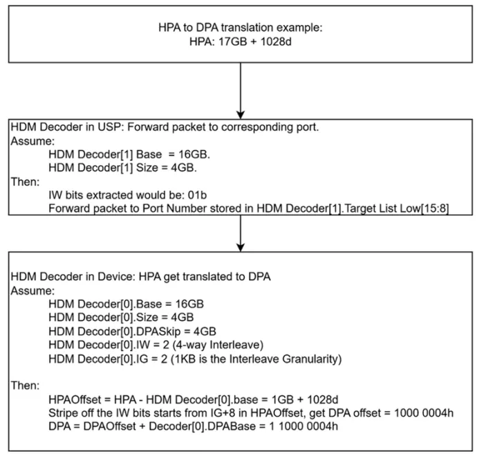The CXL HDM decoder enables the routing of both CXL.mem and UIO transactions targeting HDM. HDM Decoders are responsible for translating incoming Host Physical Addresses (HPA) into corresponding Device Physical Addresses (DPA), allowing memory accesses to be correctly directed to the appropriate device.