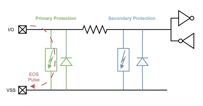 - Secondary protection approach: In this approach, IC designers keep the I/O circuits the same while changing only the ESD protection clamps to handle IEC 61000-4-5 requirements. The protection consists of three elements: a primary ESD protection with high voltage tolerance, isolation resistance, and a secondary ESD protection close to the I/O transistors.