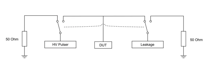 The measurement setup is shown in fig. 2, where we have 50 Ohm terminations and switching between a high-voltage pulser and a leakage measurement of the DUT to monitor failure.