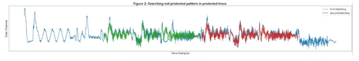 To identify the countermeasure validating the protected traces, we searched for similarities between a) the traces from the protected implementation and b) the traces from the unprotected implementation. A classical approach is to identify high-level patterns and find by correlation, the parts of the unprotected traces within the protected traces. Figure 2 shows that there is a repetition of similar activity in the protected traces. At this point, the countermeasure might be either a first-order masking or the execution in random order of two operations, one with random data, the other with the real data. We keep these two assumptions in mind and continue our analysis.