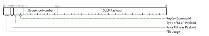 Additionally, the DLLP Payload Type field defines the interpretation of bits 31 to 0, specifying the nature of the payload data and enabling correct parsing by the receiver. Finally, the Sequence Number field, located in bits 41 to 32, serves different purposes depending on the Replay Command type. It may be used to track the order of flits, identify missing packets, or coordinate selective retransmissions, depending on the context of the communication.