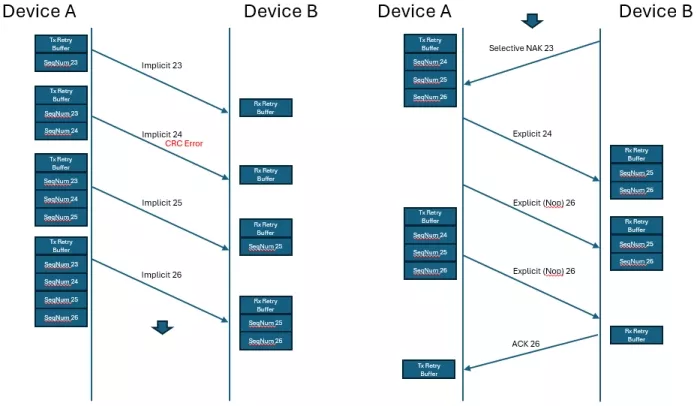 In this diagram, Device A is transmitting a sequence of flits to Device B, specifically those with implicit sequence numbers 23, 24, 25, and 26. During this transmission, the flit with sequence number 24 is corrupted, which is visually indicated with the message in red. Upon detecting the corrupted flit, Device B initiates a selective replay mechanism by issuing a Selective NAK referencing sequence number 23. This request prompts Device A to retransmit only the necessary flits rather than the entire sequence. As part of the selective replay process, Device A sends an explicit flit containing sequence number 24, followed by another explicit flit with sequence number 26 if there isn't new payload flits to be transmitted, in case that there is a new one the Device A should transmit the new sequence number 27. This approach ensures that only the relevant data is retransmitted, optimizing link efficiency and minimizing unnecessary traffic. In the meantime, Device A removed the flit 23 from the Tx Retry buffer. And the Device B will remove the 25 and 26 from Rx Retry Buffer, because this will be processed with the 24.