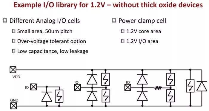Sofics’ innovative design is not only limited to the 28nm node; the same architecture has been successfully applied to other process nodes. In the most advanced CMOS or FinFET processes the maximum I/O voltage is strongly reduced. In 7nm the highest voltage available in the GPIO library is only 1.8V. It is further reduced to 1.5 or 1.2V in 5nm/4nm FinFET technology.