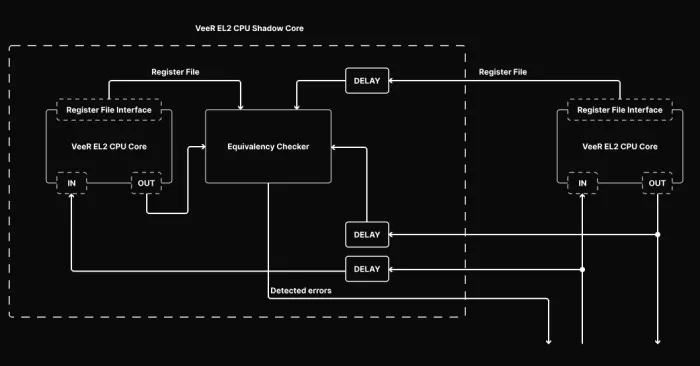To determine whether a discrepancy has occurred immediately, a reasonable subset of the VeeR EL2 registers from the register files from both cores will be compared. The DCCM and ICCM memories are not duplicated, and only the main VeeR EL2 CPU core has access to them. The Shadow Core is only supplied with the delayed inputs to the Main Core, including the relevant DCCM and ICCM data, without any ability to read from, or write to, those memories by itself. Both cores operate on separate register files. The Shadow Core’s register file can be monitored via the exposed Register File Interface.