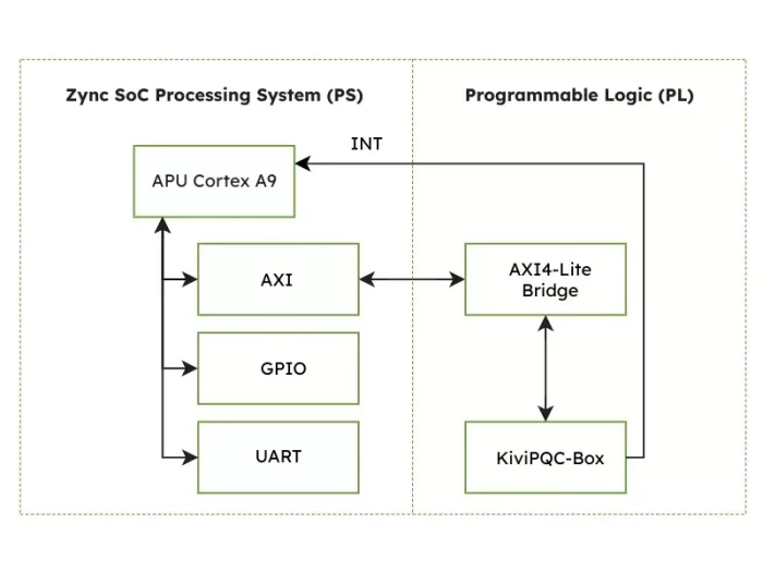 In this article, we walk through how the KiviPQC-Box IP Core works, how it connects to an AMD Zynq-7000 system via AXI4-Lite, and how the software stack (HAL, driver, application layer) helps developers build secure systems with minimal overhead. The goal is to give FPGA and embedded software engineers a clear, practical view of what PQC integration looks like on a real platform.