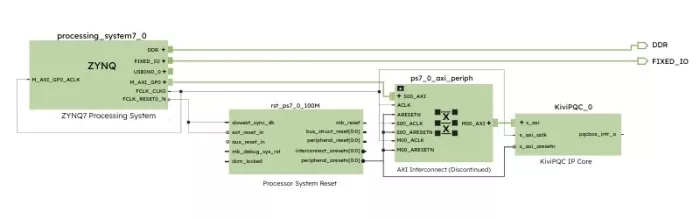 - Block design: In the Vivado block design, the Zynq Processing System (PS) is connected to an AXI interconnect. The IP Core is directly connected using the Vivado automated tool flow.
