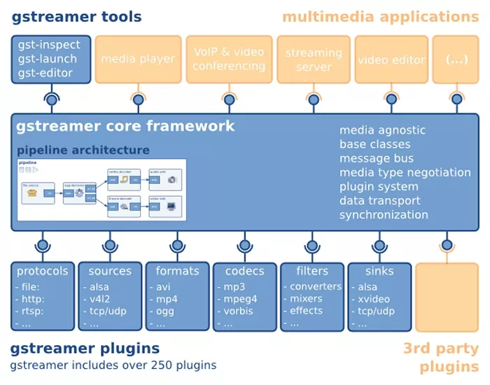 GStreamer is an extensible multimedia framework built around plugin-based pipelines—you string together elements like sources, codecs, filters, and sinks to define how media flows. See the illustration.