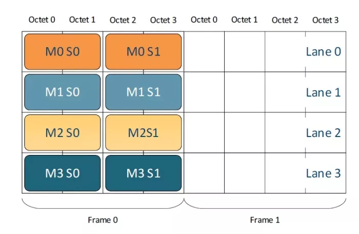 Next lets focus of allocating space for the frame data across the available JESD204 Lanes. The number of Lanes available for mapping is denoted as (L) and the diagram above suggests a quite straight forward split into 4 lanes that would result in a frame looking like the one depicted below. Here one more assumption is made that of the Frame size or length. It is always measured in Octets (8 bits) and denoted by the letter (F) that calls out the number of octets in a frame on each lane. Each active Lane will be allocated F*8 consecutive bits towards the frame container and the converter samples will be placed into this container consecutively.