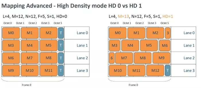 Firstly we will discuss (HD) the High-Density mode that determines if samples can be split on the lane boundaries. If HD mode is disabled, the samples cannot split on lane boundaries and instead tail bits must be added to pad out the remainder of the frame container on the lane. This might be helpful if lanes are split between multiple devices with one logic device communicating with multiple converters. It can however lead to some inefficiencies especially when Samples don’t map into full octets on each lane. When HD mode is enabled, the samples can be split and a part of a sample can be sent on one lane and the remainder on the next as depicted below, allowing for a more tightly packed frame.