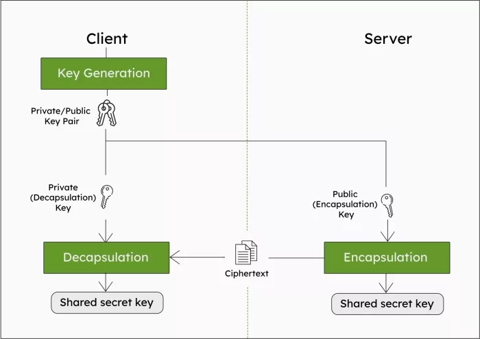 - Encapsulation (Encaps): The server uses the client’s public key to generate a random shared secret and a ciphertext. Then the server sends the ciphertext to the client.