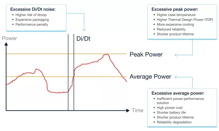This article begins by examining how the absence of on-chip monitoring impacts peak power, average power, and Di/Dt noise (rate of current change), as illustrated in the diagram below and the subsequent discussion. It then details how these aspects change when in-chip telemetry is available.