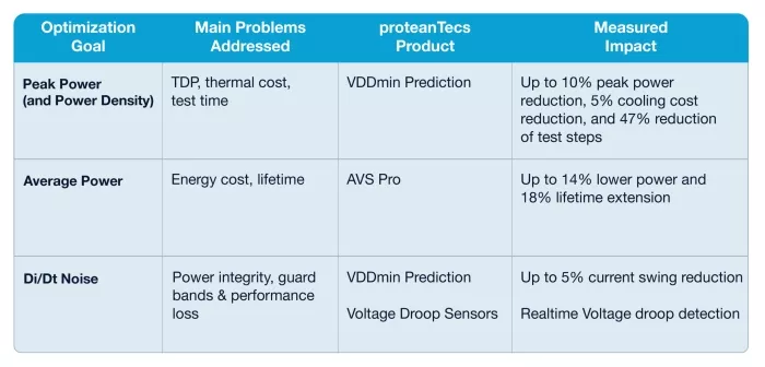 Table 1: The impact of the proteanTecs on-chip monitoring solutions on three key optimization goals.