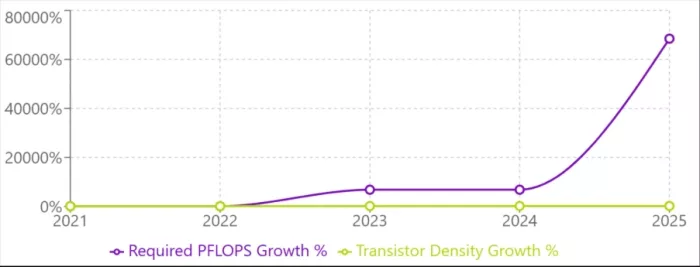 Growth in transistor density versus the PFLOPS required to train AI models from a 2021 baseline. By 2024, AI compute requirements surged by 6847%, while transistor density grew by only 183%. 2025 value is based on the projected PFLOPS required to train GPT-5. Source: Mollick, E. (2024). Scaling: The state of play in AI. One Useful Thing.