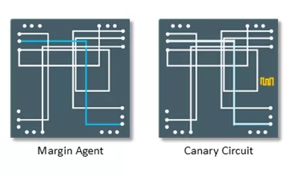 Unlike canary circuits (right, in yellow), proteanTecs uses on-chip Margin Agents (left, in blue) that monitor true critical paths.