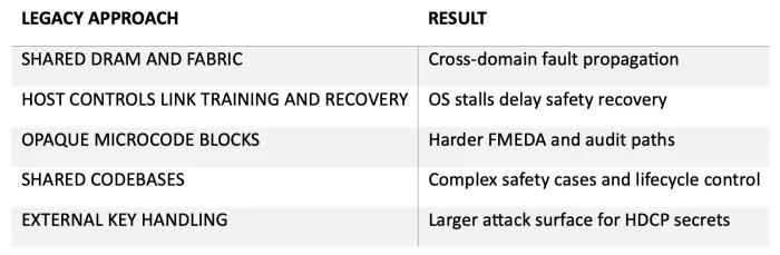 Traditional tightly coupled SoC graphics architectures, once favored for integration efficiency, now create shared-failure domains that are difficult to partition and certify. When a display feeds a safety function, “shared resources” can become “shared liability.”