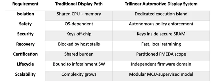 Trilinear Technologies’ approach — a DisplayPort system supervised by an isolated RISC-V control core with dedicated HDCP, DSC, MST, and AUX management, fortified with Automotive Extensions for safety policy enforcement, redefines display control as a protected, deterministic, and independently recoverable function.