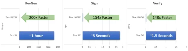 PQSecure Technologies provides hardware acceleration solutions for the XMSS (eXtended Merkle Signature Scheme) algorithm through hardware/software co-design and dedicated IP cores—optimized especially for embedded systems incorporating eFPGA technology. As shown below, this co-design approach dramatically improves the performance and efficiency of XMSS operations compared to pure software implementations in typical edge IoT applications. By selectively running certain components on the processor, it can also reduce hardware requirements by up to 25% relative to a fully hardware-based design.
