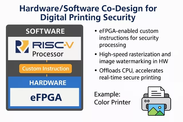 Beyond print security, this co-design approach exemplifies the broader value of eFPGA-enabled processors. The ability to create custom instructions in hardware—while maintaining software control—enables continuous adaptability to new algorithms, security standards, and performance demands without respinning silicon. In the printing example, the same eFPGA fabric could later be reconfigured for laser-control logic, image compression, or new watermarking schemes, ensuring long-term product evolution. Menta’s standard-cell eFPGA makes this flexibility native to the SoC, bridging software agility with deterministic hardware performance—precisely the kind of design paradigm driving the next generation of intelligent, secure, and adaptable embedded systems. For more details on this, visit Essential eFPGA Resources and Tools @ Menta.