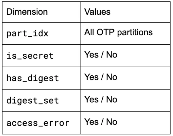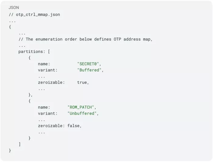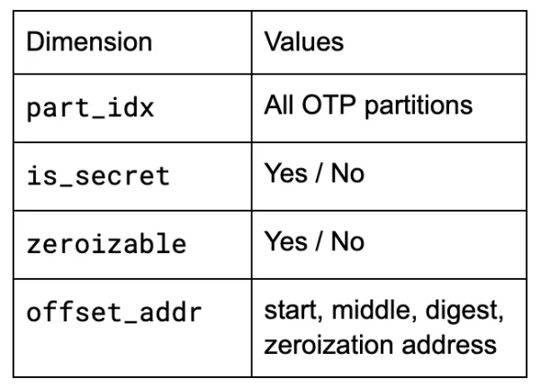 As a first practical detail, we need to consider which parts of OTP should be zeroized in the first place. In order to store different kinds of device state, the OTP is split up into partitions, some of which contain secrets that should be zeroized, and some of which contain data that shouldn’t.