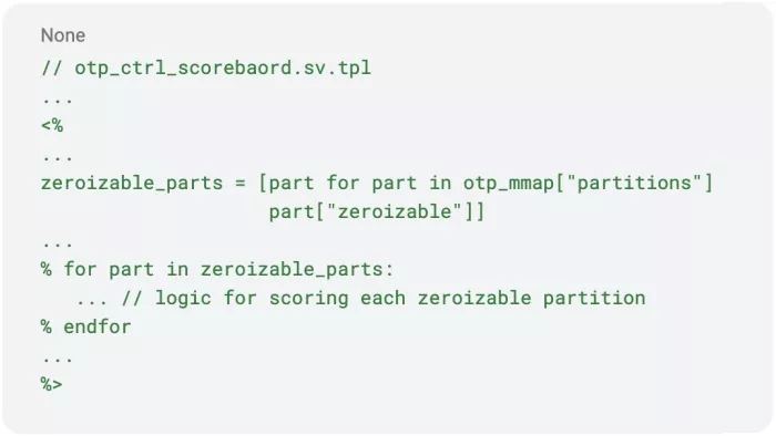 In order to make this testing framework maintainable, it needs to adapt to any changes to the OTP layout. As such, we made the testbench configuration-driven: any changes to the OTP memory map are reflected in the virtual sequences, scoreboard, and covergroups. Upon building the testbench, the HJSON OTP memory map is parsed and the resulting partitions are used to fill in Mako templates for the testbench source files:
