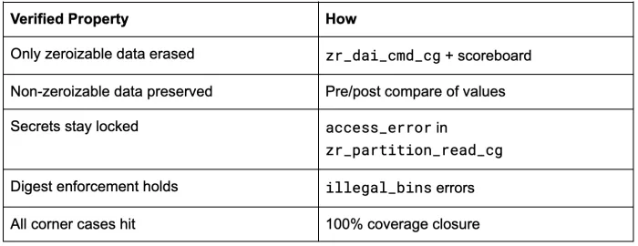 Together, these elements of our testbench allow us to continuously ensure that the OTP zeroization mechanism works exactly as intended. Below is a table of the properties we were able to verify regarding this mechanism: